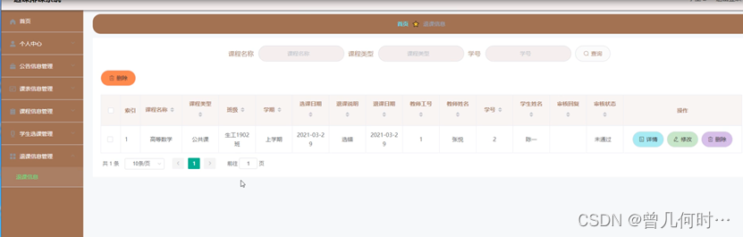 学生选课管理:通过列表可以查看课程名称、课程类型、班级、学期、选课日期、状态、教师工号、教师姓名、学号、学生姓名、备注、审核回复、审核状态等信息,管理员可以进行查看详情、修改、删除操作