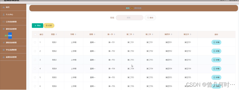 课表信息管理:通过列表可以获取班级、学期、星期、第一节、第二节、第三节、第四节、第五届等信息,进行在线查看课表信息