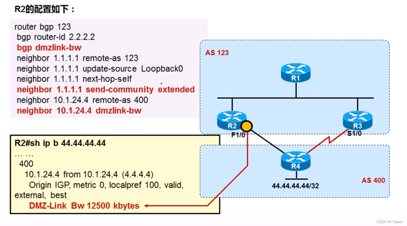 - neighbor 10.1.24.4 dmzlink-bw <<<<<<<<<<<只能对EBGP领居使用