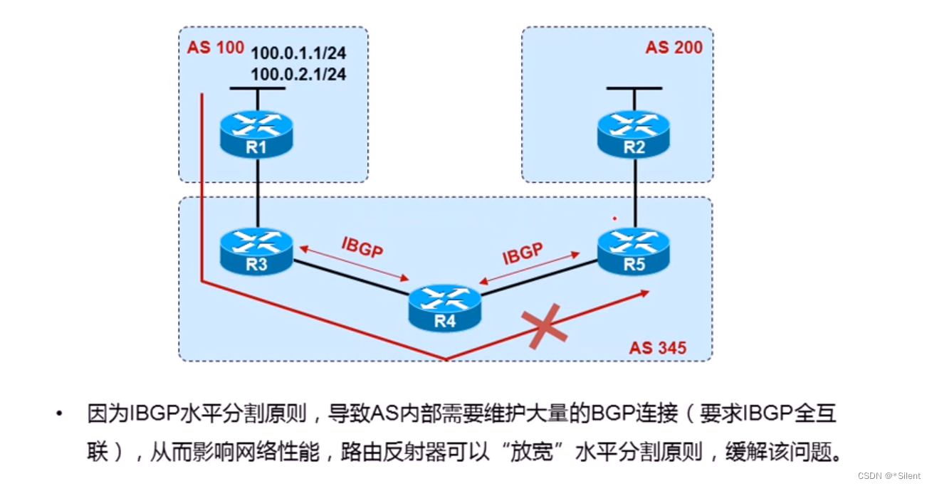·从IBGP获得的路由不向它的IBGP邻居通告(水平分割)