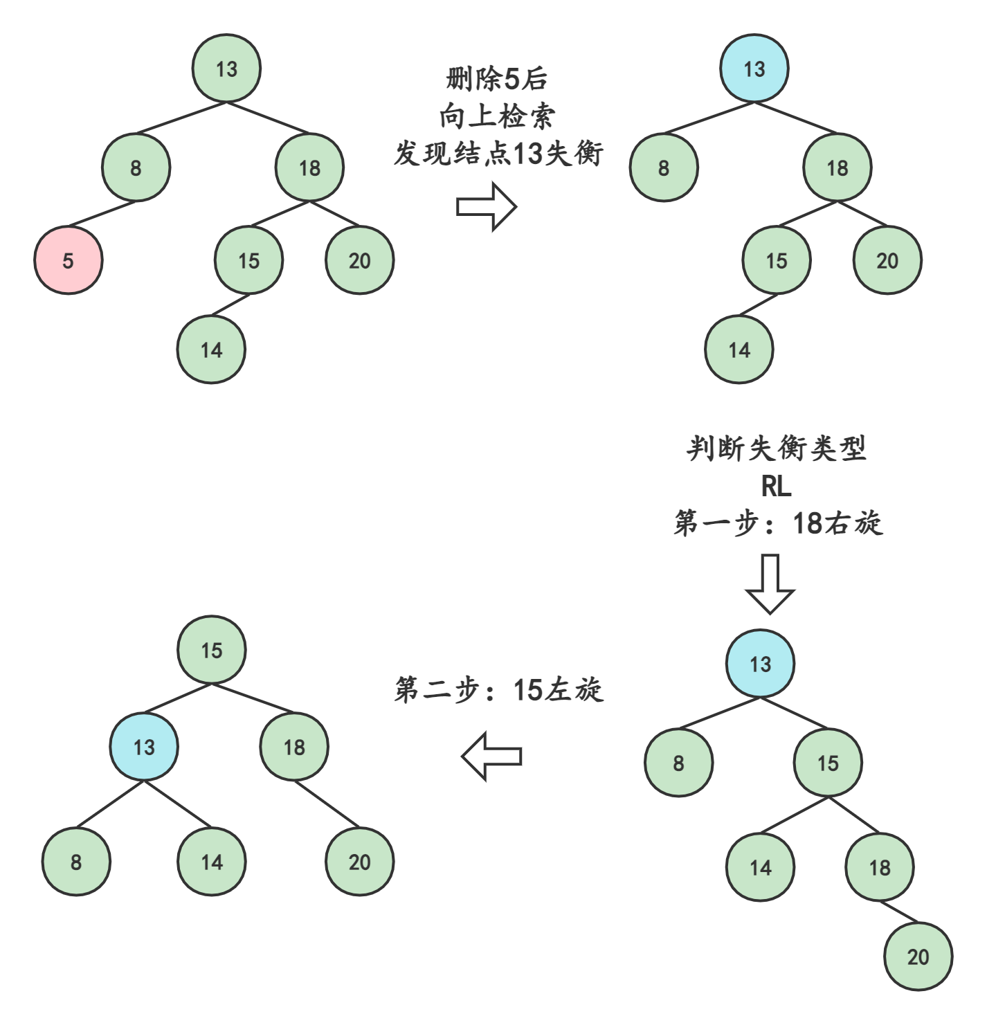 删除叶子节点后要看,平衡二叉树是否失衡,如果没有失衡就直接删除即可;如果出现了失衡的情况就要从根节点开始向上依次检索看从哪个位置开始失衡了,一经发现失衡就进行相对于的旋转处理,直到根结点为止。