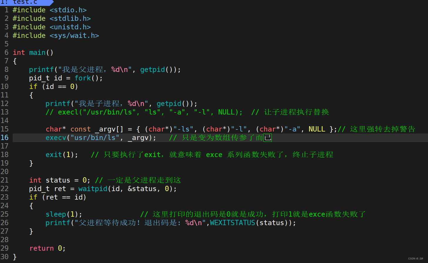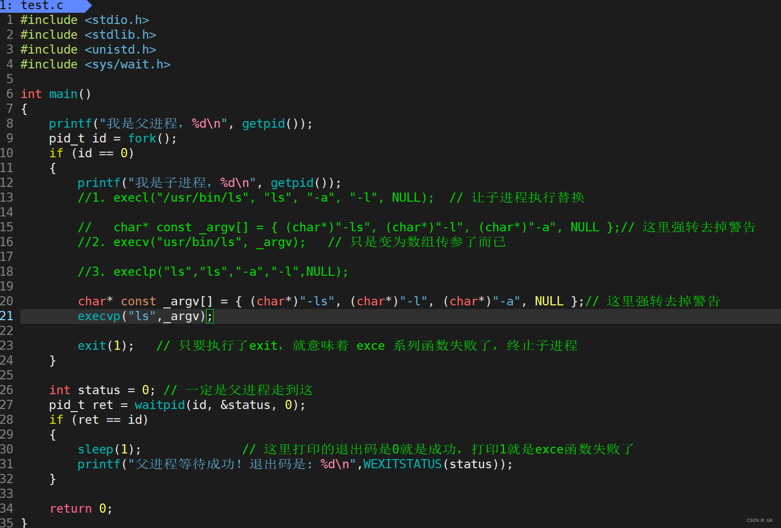 - execl("/usr/bin/ls", "ls", "-a", "-l", NULL); // 让子进程执行替换