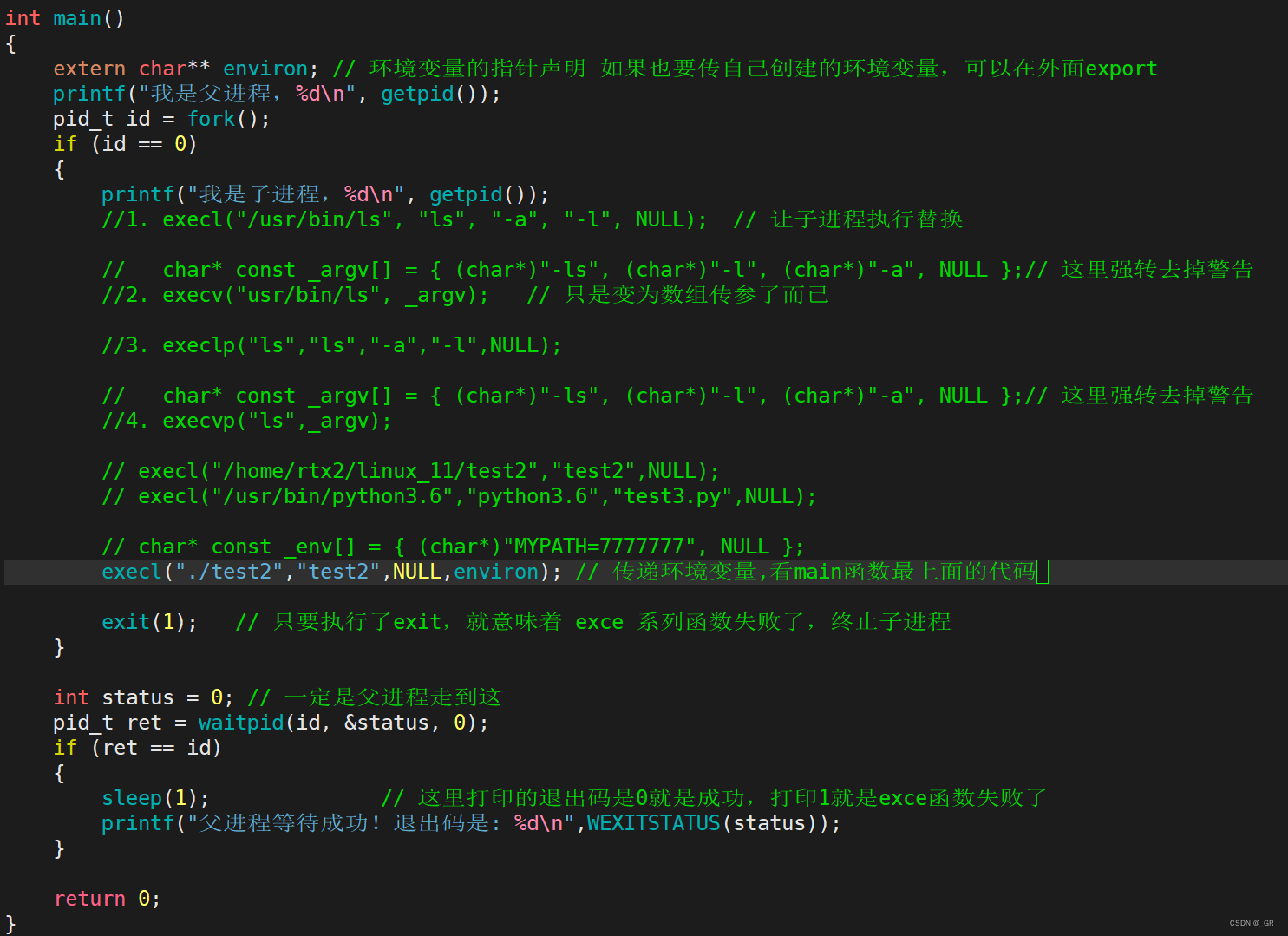 如果你 exel 函数簇带 e,就相当于你选择了自己传,就会覆盖式地把原本的环境变量弄没,然后你自己交给子进程。如果不带 e,那么环境变量就会自己被子进程继承。