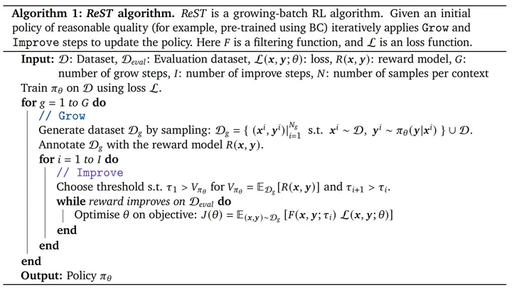 如何将LLMs的输出与人类偏好或价值观进行高效的对齐,是目前提升LLMs性能的关键问题,如果没有进行适当的对齐处理,LLMs可能会产生风险高或完全错误的内容,这对于下游应用程序具有毁灭性的影响。目前常用的RLHF方法通常使用人类反馈的标注数据来学习一个奖励模型,然后将其用于强化学习目标来对LLM进行微调对齐。但是RLHF通常依赖于在线RL方法,例如PPO[1]和A2C[2],这就需要在模型训练过程中多次使用奖励模型来从更新后的策略中采样新样本,这会带来高昂的计算代价。为了解决这一问题,本文提出了一个自训练强化学习算法ReST,ReST将人类标注员从反馈训练循环中丢弃,自行生成并使用离线数据进行反馈训练。作者巧妙地设计了一个内外循环机制,如下图所示。