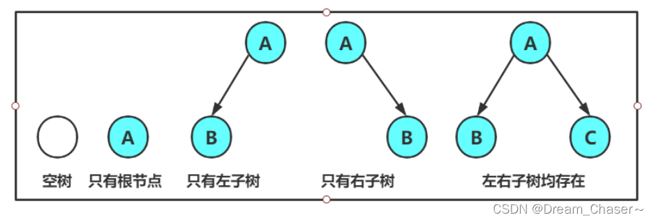 1. 二叉树不存在度大于2的结点(度为0也可以)2. 二叉树的子树有左右之分,次序不能颠倒,因此二叉树是有序树注意:对于任意的二叉树都是由以下几种情况复合而成的:![]()
