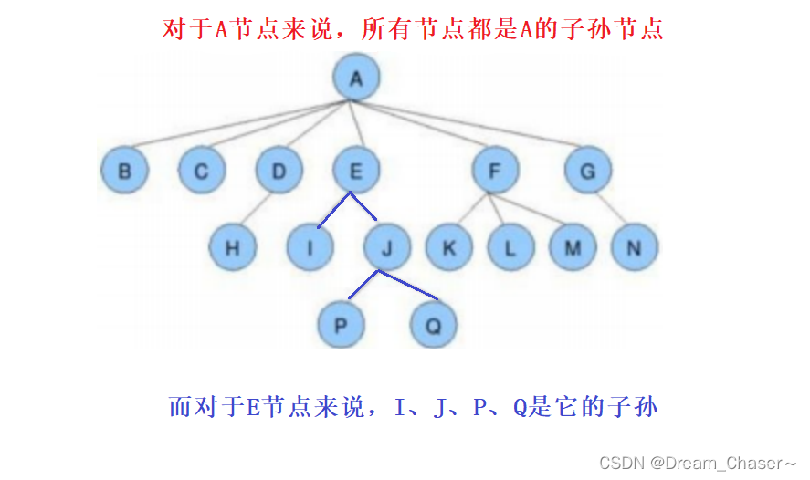 ✅子孙:以某节点为根的子树中任一节点都称为该节点的子孙。如上图:所有节点都是A的子孙