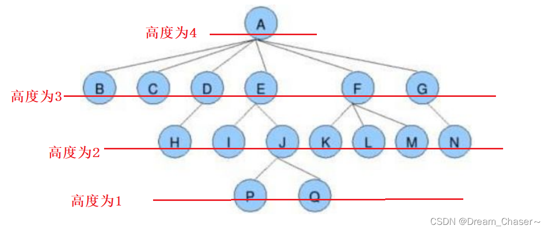 ✅树的高度或深度:树中节点的最大层次; 如上图:树的高度为4
