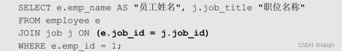 其中,USING 表示使用两个表中的公共字段(job_id)进行等值连接。 另外,查询语句中出现的公共字段无须添加表名限定。