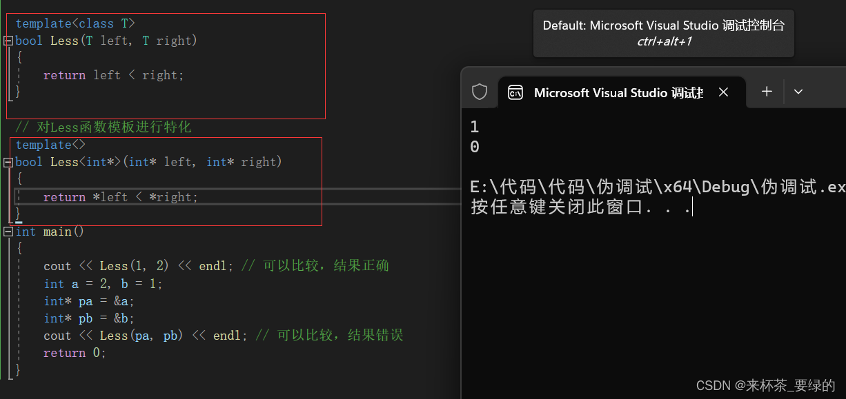 可以看到, Less 绝对多数情况下都可以正常比较,但是在特殊场景下就得到错误的结果。上述示例中, pa 指向的a 显然大于 pb 指向的b ,但是 Less 内部并没有比较 p1 和 p2 指向的内容,而比较的是 p1 和 p2 指针的地址,这就无法达到预期而错误。此时,就 需要对模板进行特化。即:在原模板类的基础上,针对特殊类型所进行特殊化的实现方式 。