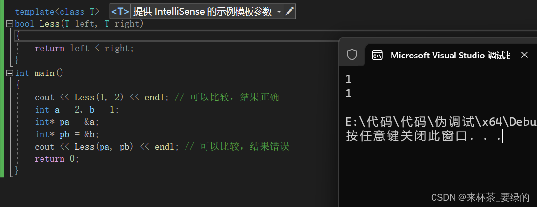 注意:1. 浮点数、类对象以及字符串是不允许作为非类型模板参数的(只能是整型) 。2. 非类型的模板参数必须在编译期就能确认结果 。