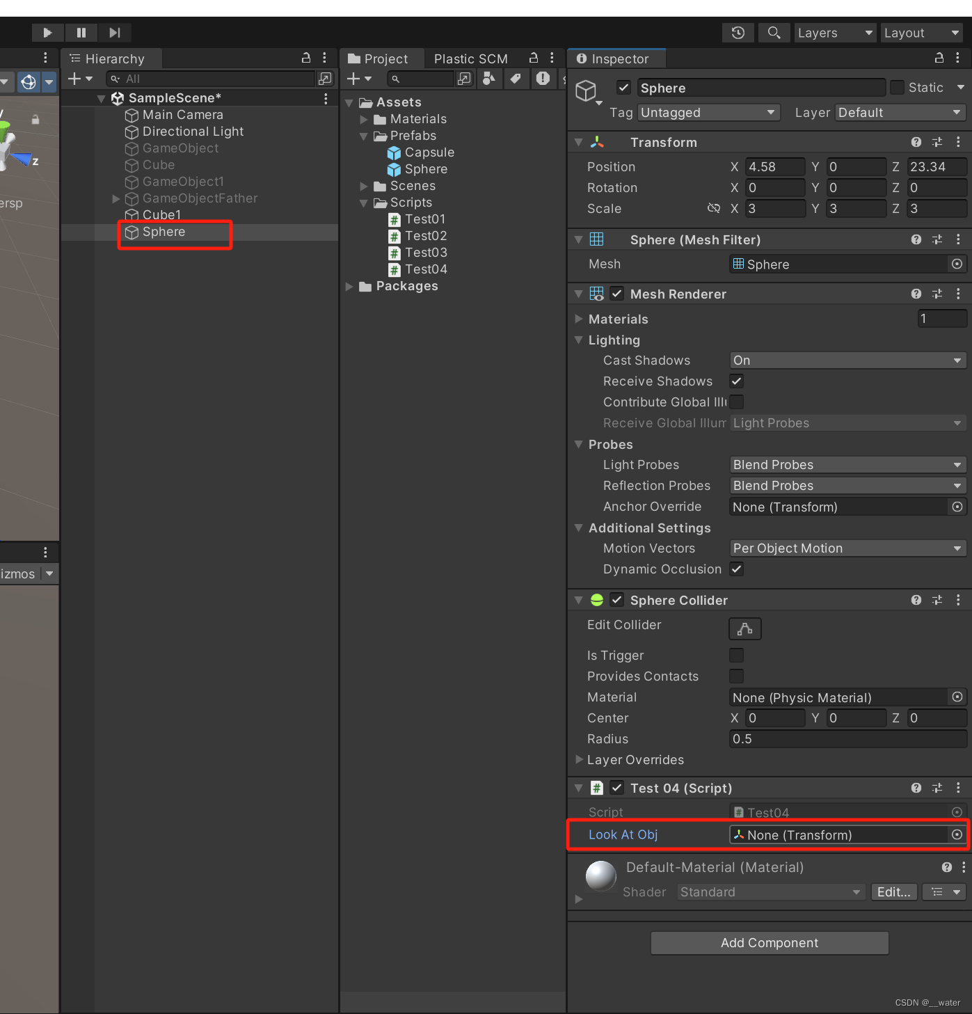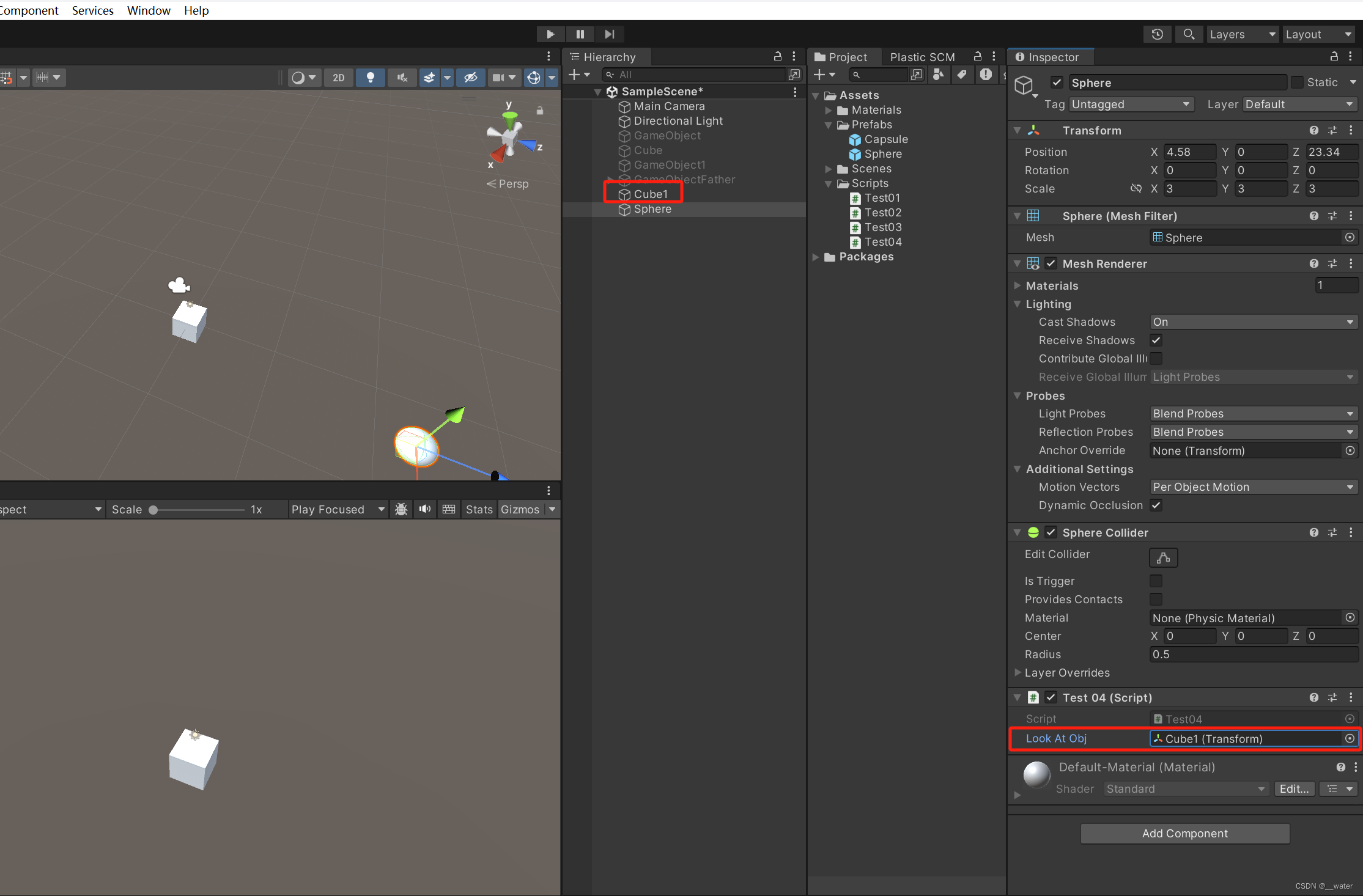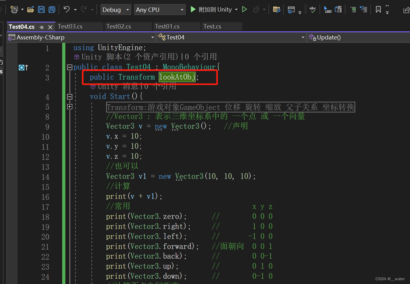 首先我们在代码中写一个公共框 设置为看向物体