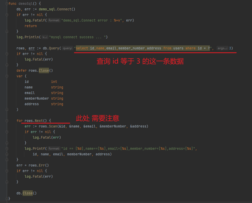 可以发现,本次的查询语句是 select id,name,email,member_number,address from users where id = ? ,我们再一条数据一条数据的读取出来(此处需要注意使用读取 rows.Next() 的时候,需要读取完毕之后,关闭句柄,否则会资源泄漏)