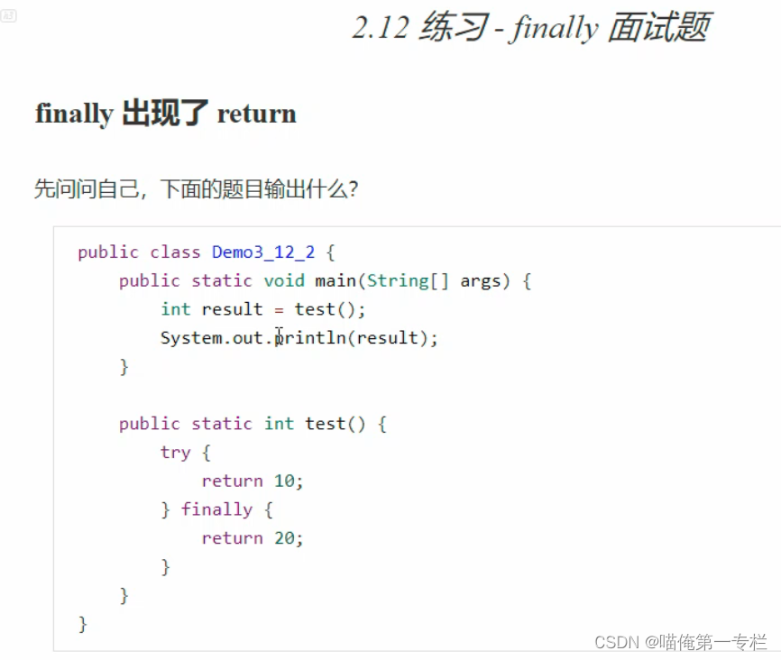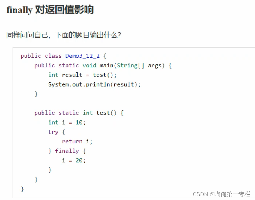 我们发现在try中return了,在finally里又对这个变量做了变化,其实它是不会影响返回结果的,因为他在return之前做了一个暂存,我们发现只要finally中只有不return是没有问题的