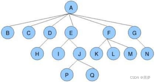1.2.12.子孙:以某节点为根的子树中任一节点都称为该节点的子孙。如上图:所有节点都是A的子孙。