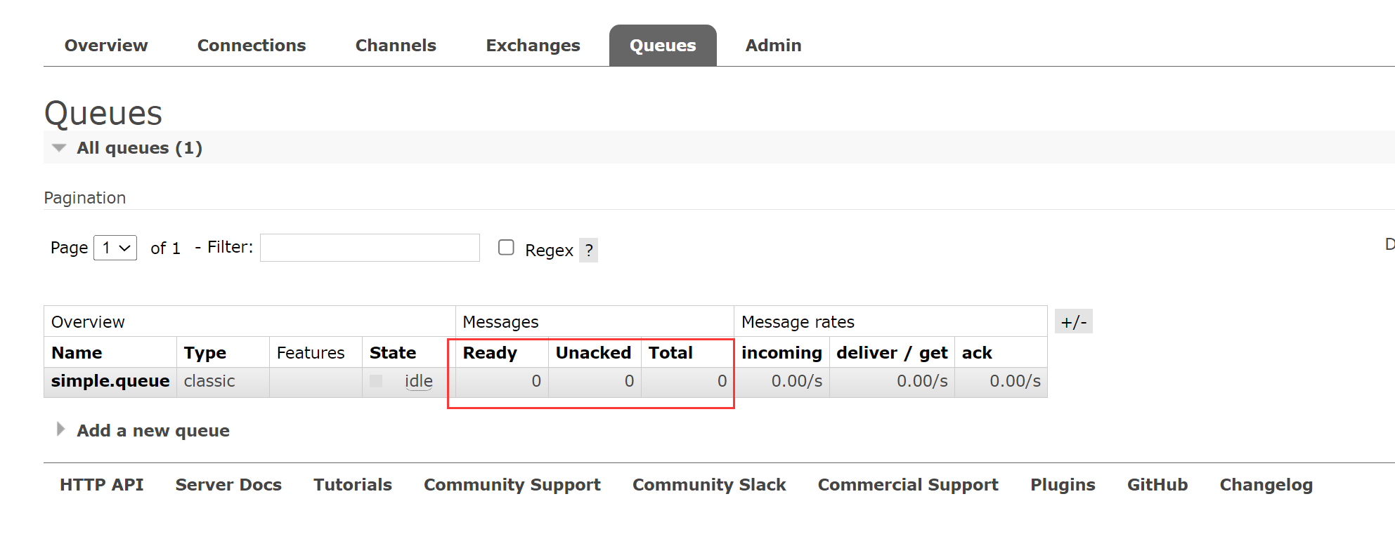 在 RabbitMQ 的管理页面中, simple.queue 队列中消费过的消息也被删除了: