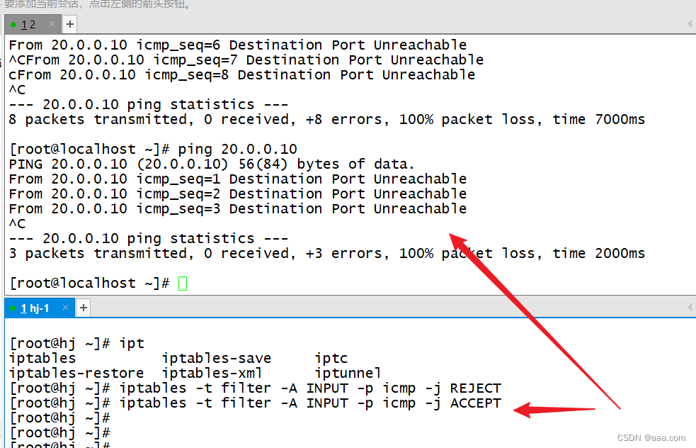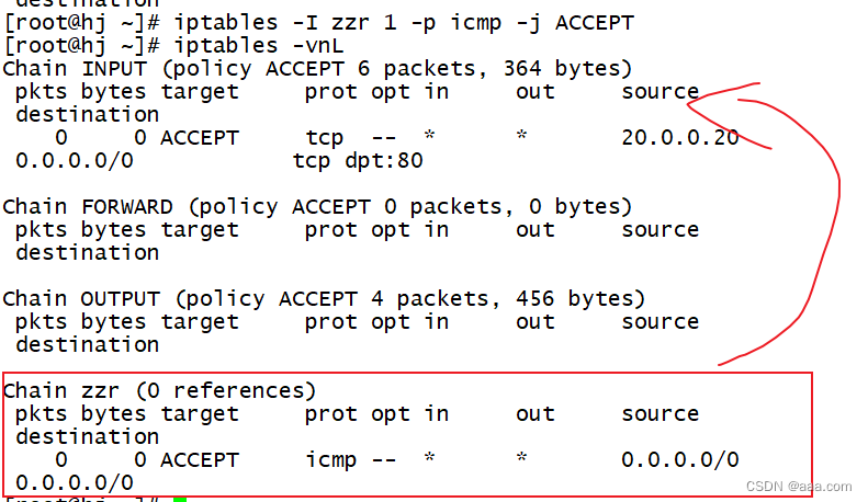 - [root@hj ~]# iptables -A INPUT -i ens33 -s 20.0.0.0/24 -j DROP