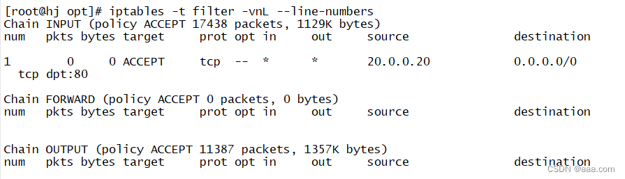 [root@hj opt]# iptables -t filter -vnL --line-numbers