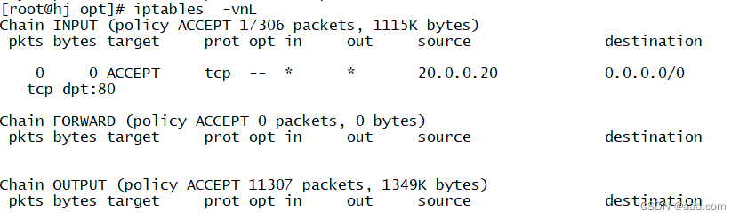 - [root@hj opt]# iptables -vnL