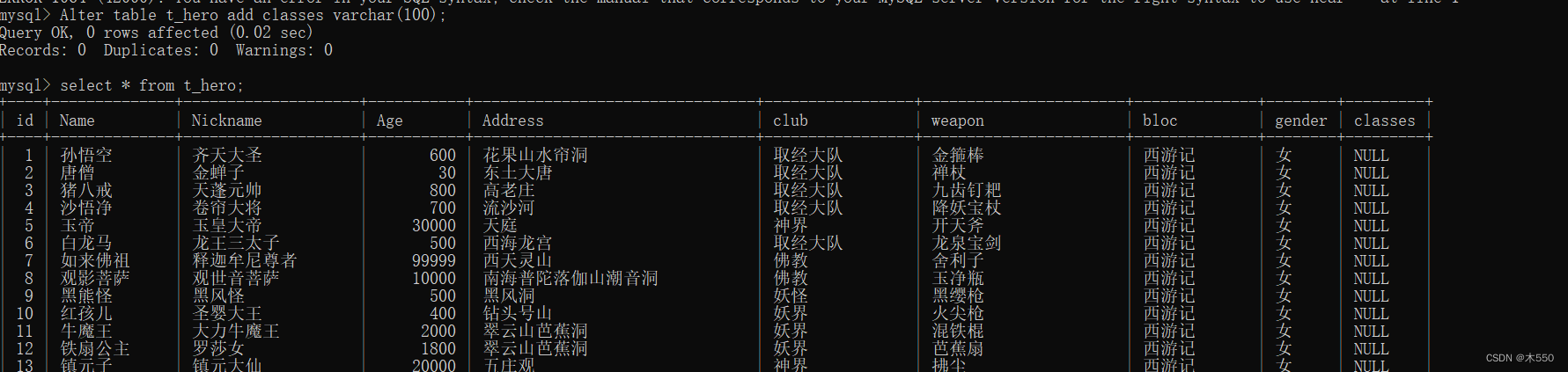 insert into t_hero(id, Name, Nickname, Age, Address,job,weapon,bloc) values(9,“黑熊怪”,”黑风怪”,500,”黑风洞”,”妖怪”,”黑缨枪”,”西游记”);