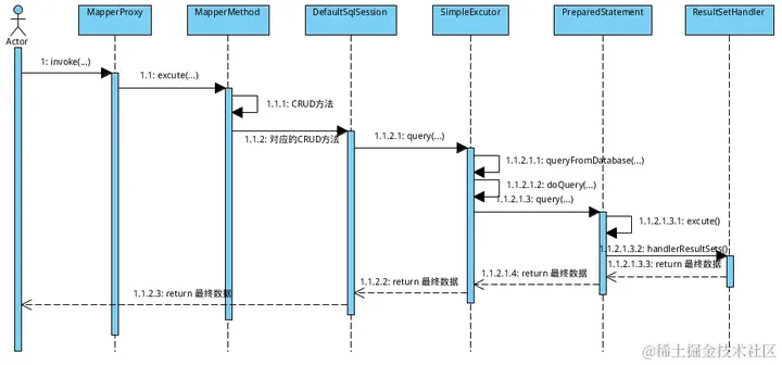 当配置文件解析完成,接口相应的代理类构建完毕后,下一步要做的就是sql的执行,这一过程逻辑大致如下所示: