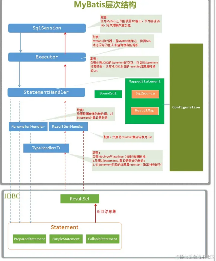 - SQL 语句解析:MyBatis 会解析 SQL 语句,包括动态 SQL,参数映射和结果映射。这包括了将 Java 对象转化为 SQL 语句中的参数,以及将查询结果映射回Java对象。