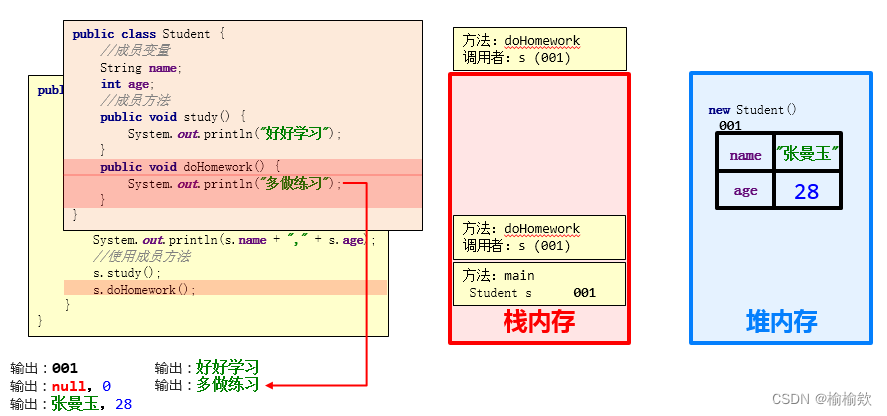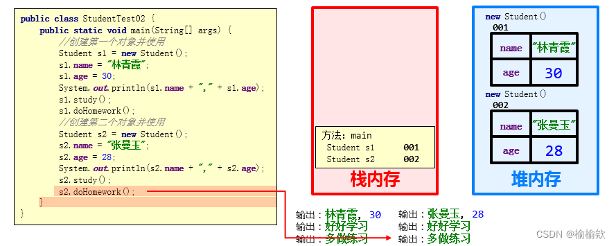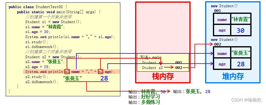public class Student { //成员变量 String name; int age; //成员方法 public void study() { System.out.println("好好学习,天天向上"); } public void doHomework() { System.out.println("键盘敲烂,月薪过万"); } } /* 学生测试类 */ public class StudentDemo { public static void main(String[] args) { //创建对象 Student s = new Student(); //使用对象 System.out.println(s.name + "," + s.age); s.name = "林青霞"; s.age = 30; System.out.println(s.name + "," + s.age); s.study(); s.doHomework(); } }