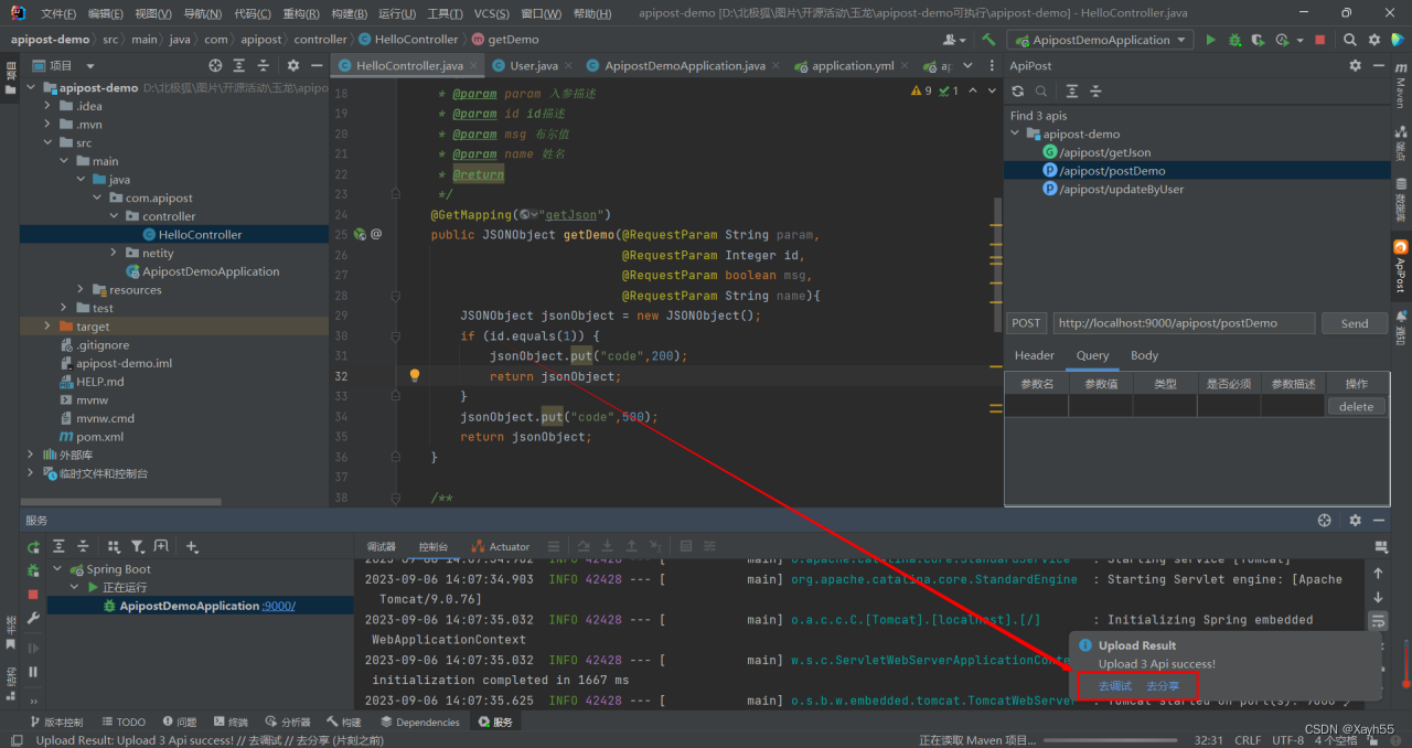 安装Apipost helper V2版本后可以点击IDEA右侧的Apipost按钮对接口进行简单调试。