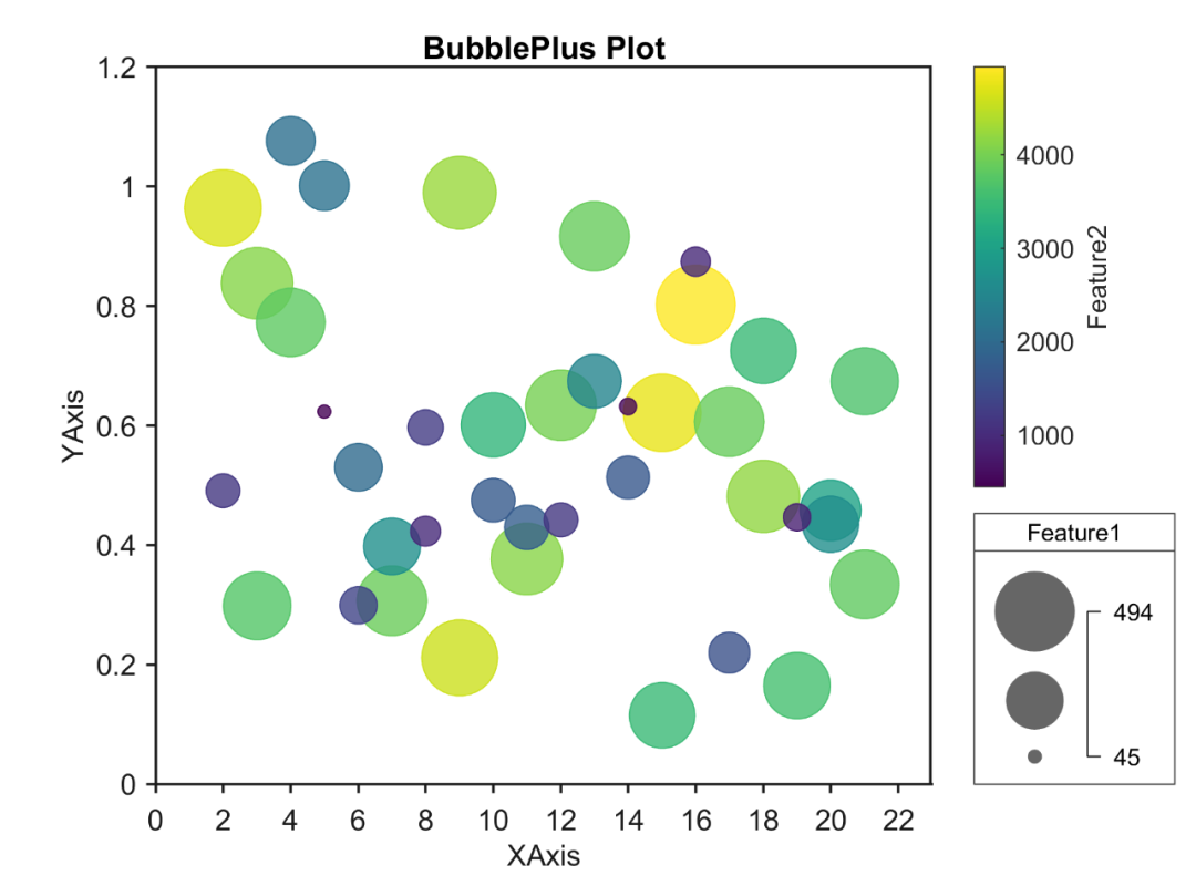 t = tiledlayout(1,1);nexttilebubblechart(xx, yy, f1, f2,'MarkerFaceAlpha',0.8);bubblesize([5 30])hTitle = title('BubblePlus Plot');hXLabel = xlabel('XAxis');hYLabel = ylabel('YAxis');