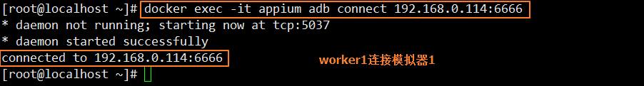 在两台worker上分别执行远程连接命令,worker1对应模拟器1,worker2对应模拟器2。这里要主要adb connect 后面跟的是模拟器的实际ip地址加tcpip端口号6666,如果看到connected to ip:端口号,说明已经远程连接成功