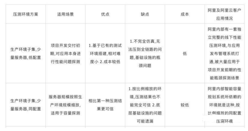 我们通过表格的形式以下 4 个压测环境方案在使用场景、优缺点、成本、阿里云及其客户的应用情况做了对比。