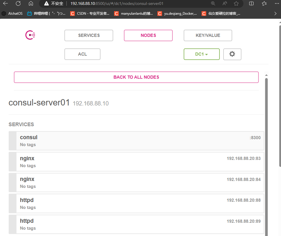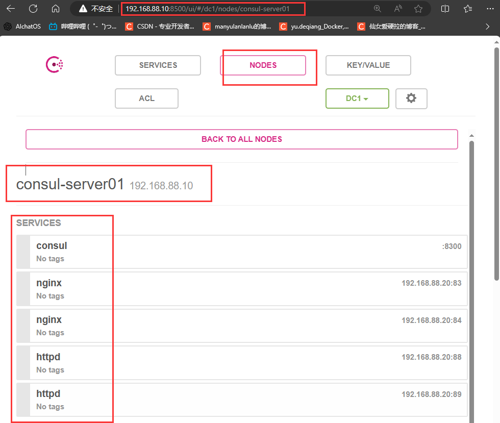 浏览器中,输入 http://192.168.88.10:8500,在 Web 页面中“单击 NODES”,然后单击“consurl-server01”,会出现 5 个服务。