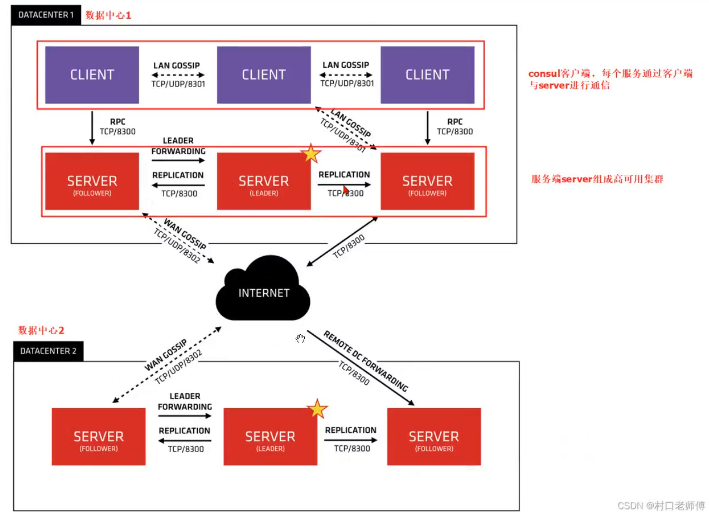 数据中心1和数据中心2都是服务端但是两者是两个数据,通过8302 wan gossip的端口进行通信