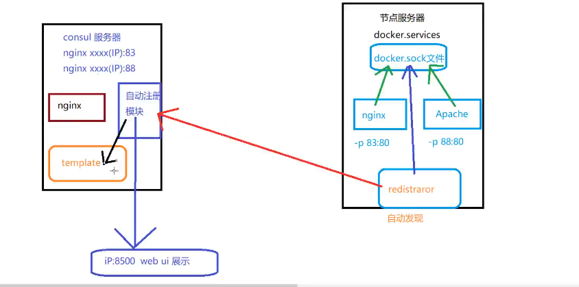 registator作为监听,监听sock里面的配置文件的变化,nginx服务会把所有的信息写在sock里面,sock里面会有nginx服务的对象,当socket中的配置文件发生变化时,registator会把数据直接发给consul服务器,目的是把nginx服务发生变化的ip加端口号写入到consul里面,consul服务器会显示一个网页,客户端可以访问这个网页,sock是docker.server服务里面的一个文件