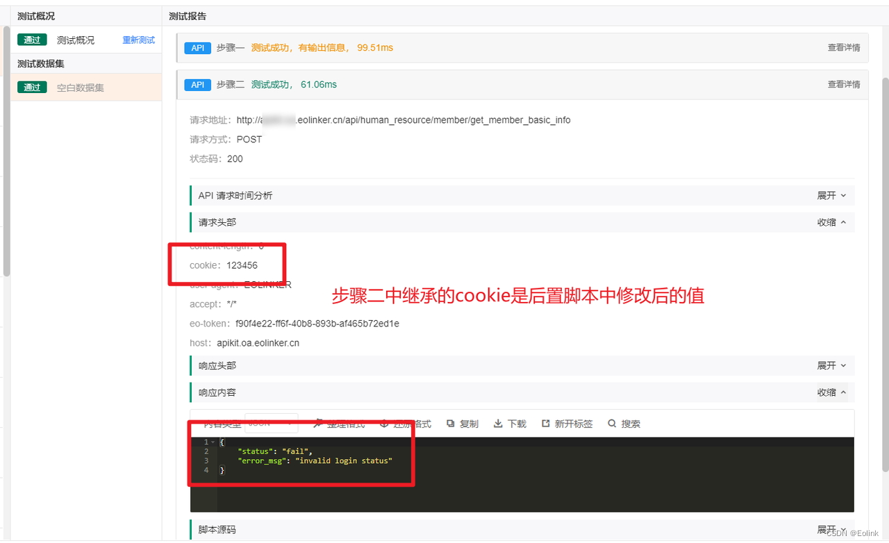在步骤一的后置脚本中通过eo.cookieStorage.set()改变cookie的值,以下为具体示例: