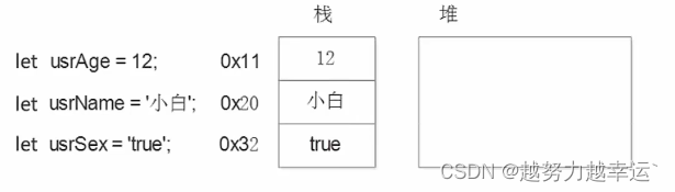 2、堆(操作系统):存储复杂类型(对象),一般由程序员分配释放,由垃圾回收机制回收。引用数据类型存放到堆里面