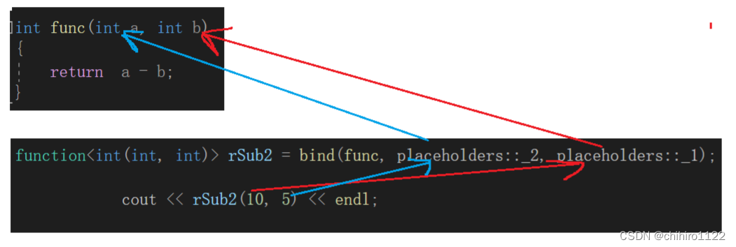 - function<int(int, int)> rSub2 = bind(func, placeholders::_2, placeholders::_1);