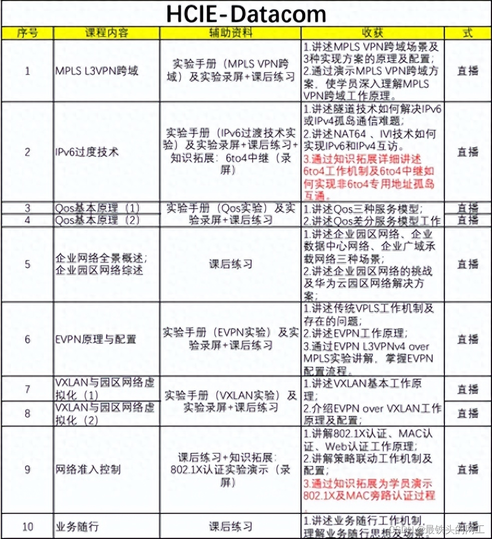 以HCIE-Datacom实验辅导为主,深度细致讲解HCIE-Datacom实验考试知识点,提供1:1实验机架全天候开放,专职实验辅导老师在线跟随,快响应,助力考生快速、高效通过HCIE认证。