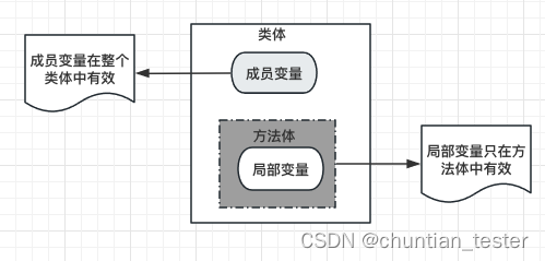 类的方法体中定义的变量(包括方法的参数)称为【局部变量】,局部变量只在当前方法代码块中有效。