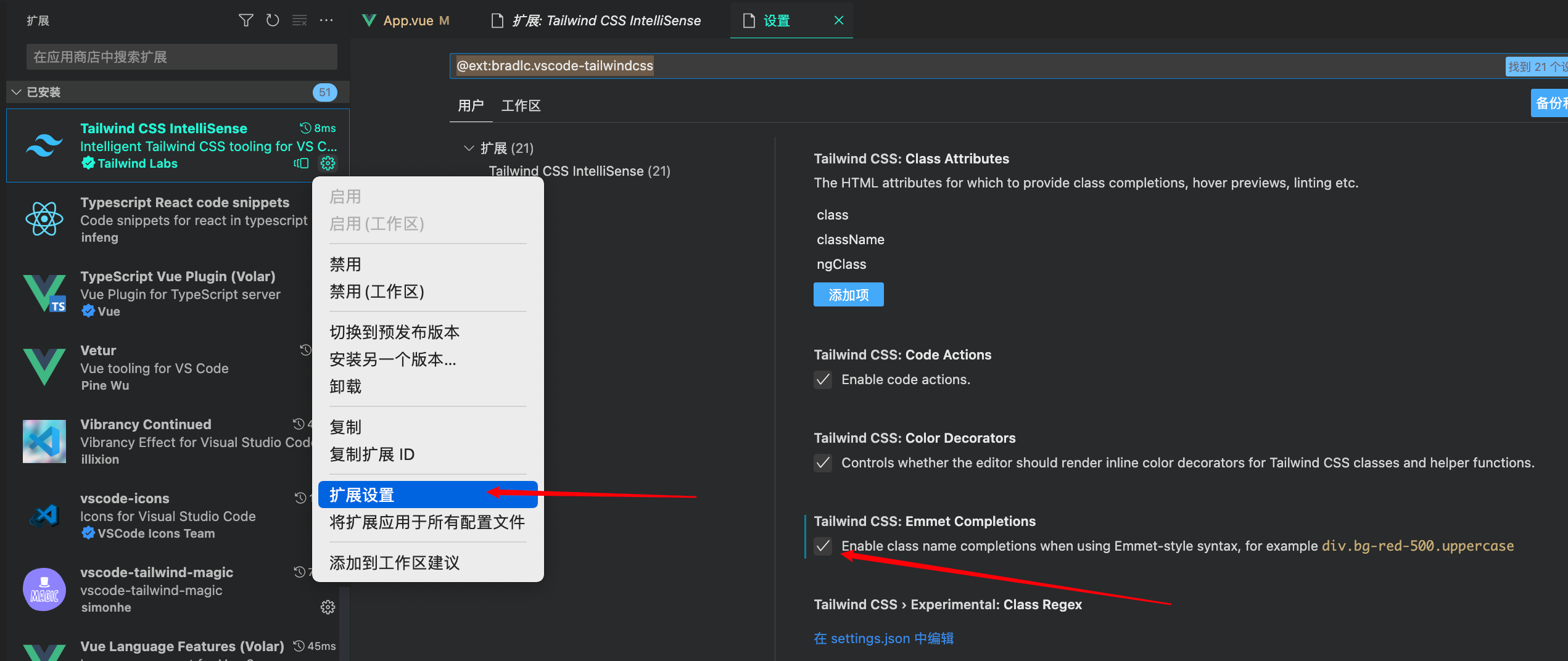 插件扩展设置中的Tailwind CSS :Emmet Completions默认是未勾选的,需要手动勾选
