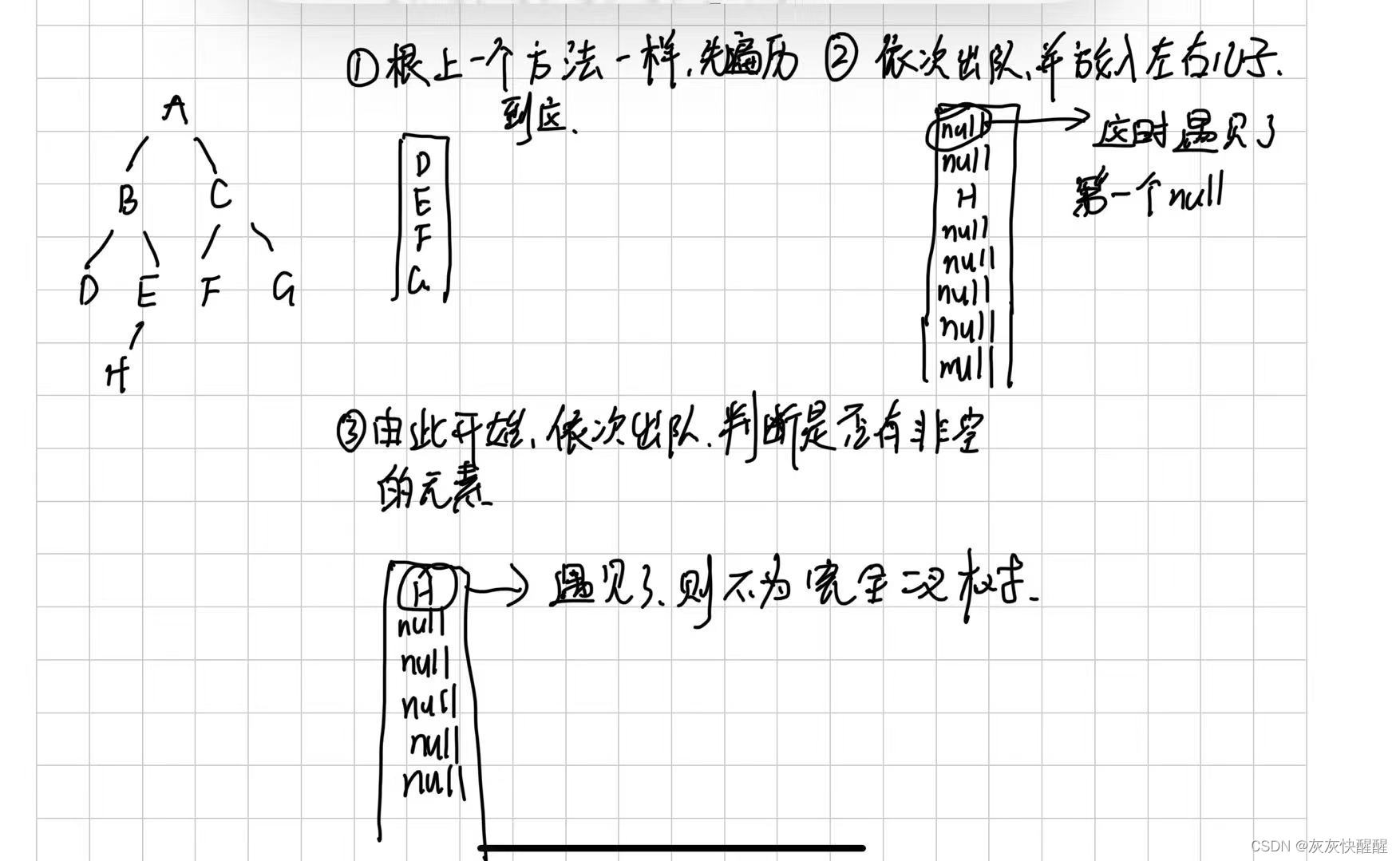 我们来回顾一下完全二叉树的性质:即完全二叉树是一棵从上到下,从左到右依次排列元素的树(即直到最后一个结点之后,其余前面的结点都不能为空)。所以我们就浮现出了这样的思路,即还是利用队列来遍历树每次,都将左右儿子放入队列(不论是不是空),当遇到了第一个为空的元素后,立刻停止放入,检查队列中剩余的元素是否有非空的,如果全是null,则是完全二叉树,如果有一个不是,就不是完全二叉树,画图如下: