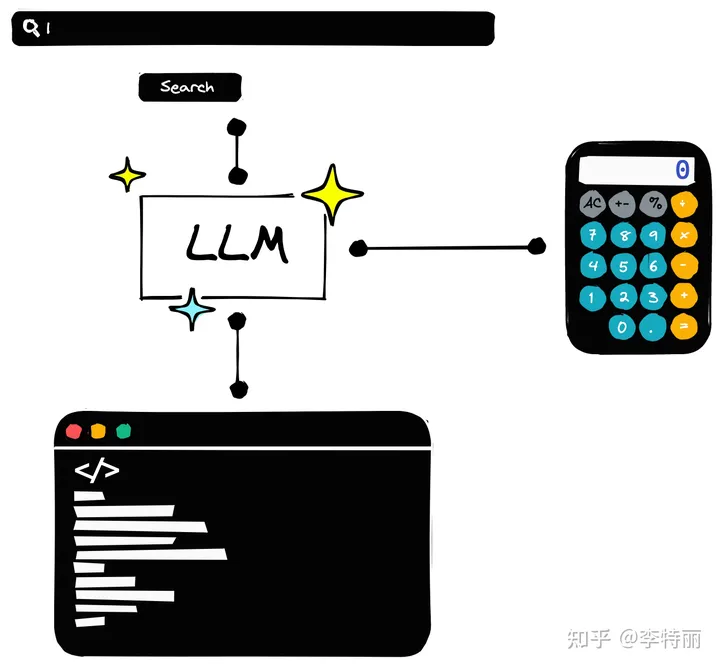 我们可以将代理 (Agents) 视为 LLMs 的工具 (Tools) 。就像人类使用计算器进行数学计算或在 Google 中搜索信息一样,代理 (Agents) 允许 LLM 做同样的事情。