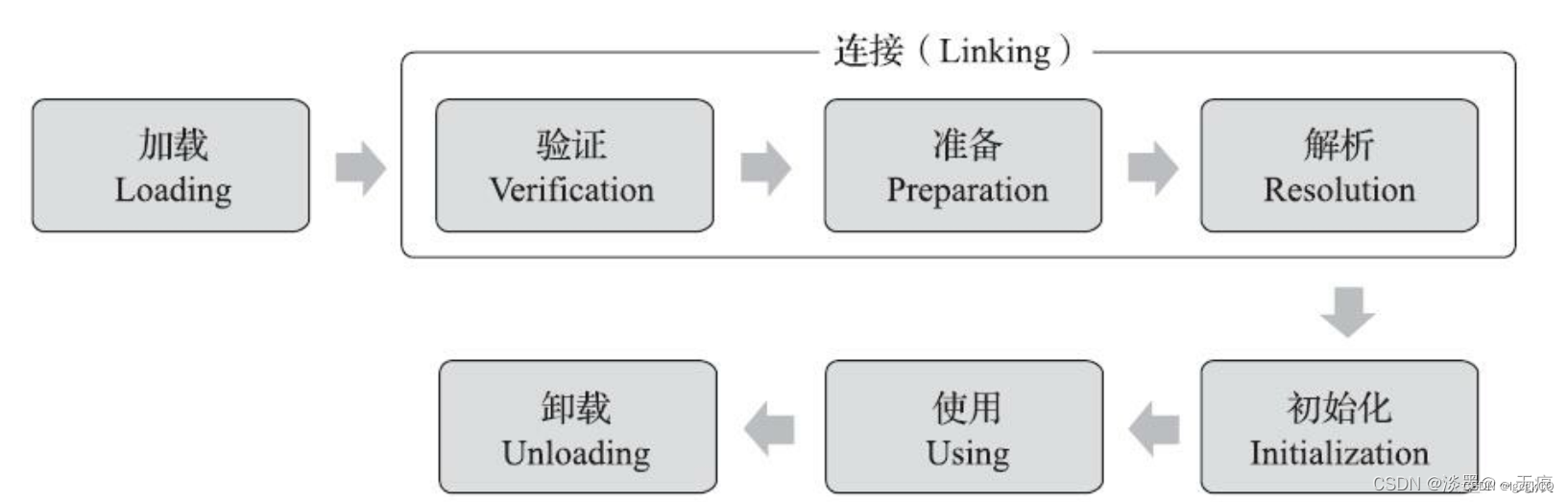 类从被加载到虚拟机内存中开始到卸载出内存为止,整个生命周期为7个阶段:加载、验证、准备、解析、初始化、使用、卸载;其中前三个阶段统称为连接