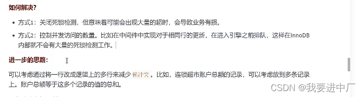 2)另一种策略就是,发起死锁检测,当MYSQL发现死锁以后,MYSQL服务器会主动进行回滚死锁链条上的某一个事务,将持有最少持有行级排他锁的事务进行回滚,将innodb_deadlock_detect设置成on,表示开启这个逻辑