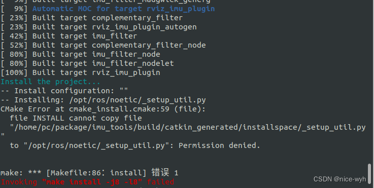 这个错误是因为在安装过程中,CMake无法将文件复制到目标路径。这可能是由于权限不足导致的。可以尝试使用以下命令更改目标文件夹的权限: