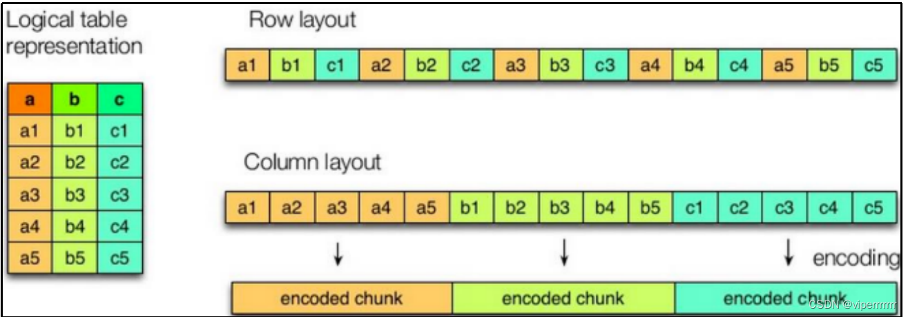 如图所示左边为逻辑表,右边第一个为行式存储,第二个为列式存储。
