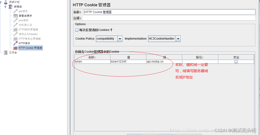需要在线程组里添加配置元件—HTTP Cookie 管理器
