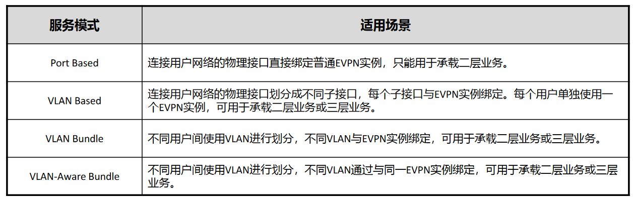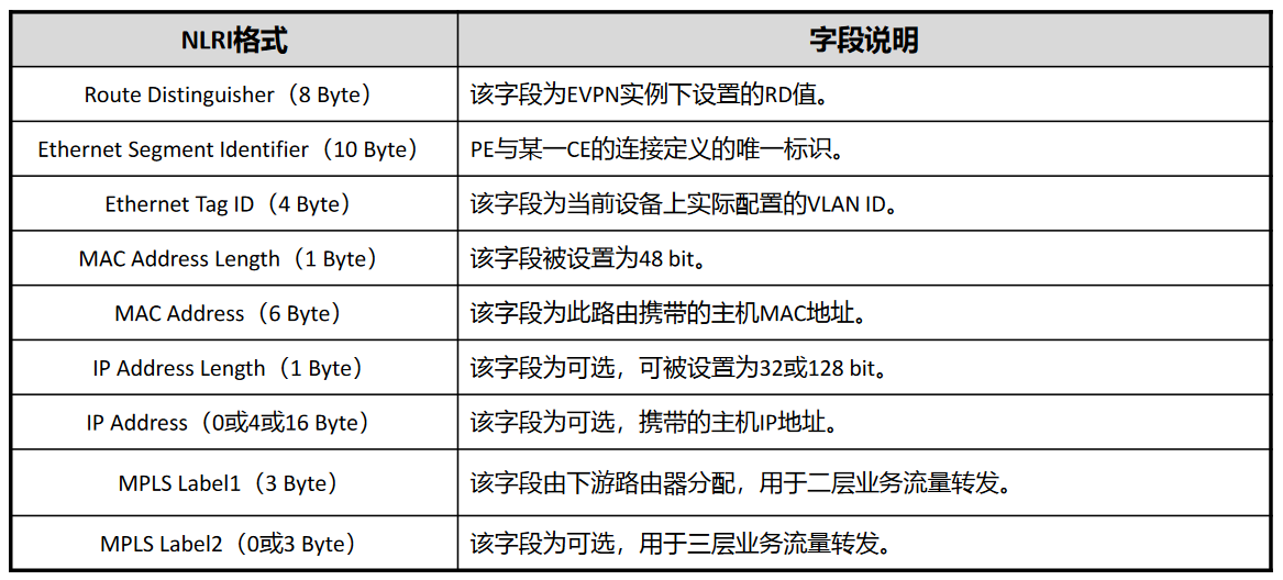 | TYPE2 MAC/IP Advertisement Route | MAC地址学习通告 MAC/IP绑定 MAC地址移动性 | 基于每个MAC的策略 ARP抑制 主机迁移 |