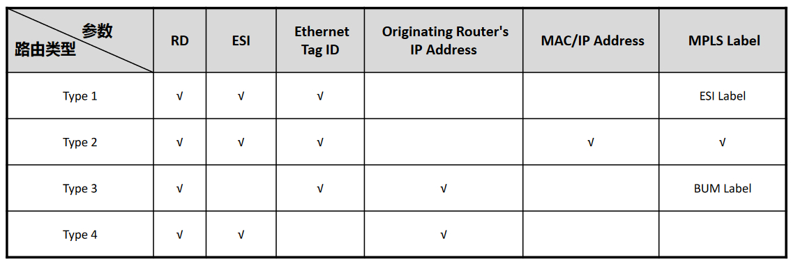 | TYPE1 Ethernet A-D Route | 别名 MAC地址批量撤销 多活指示 通告ESI标签 | 环路避免 快速收敛 负载分担 |