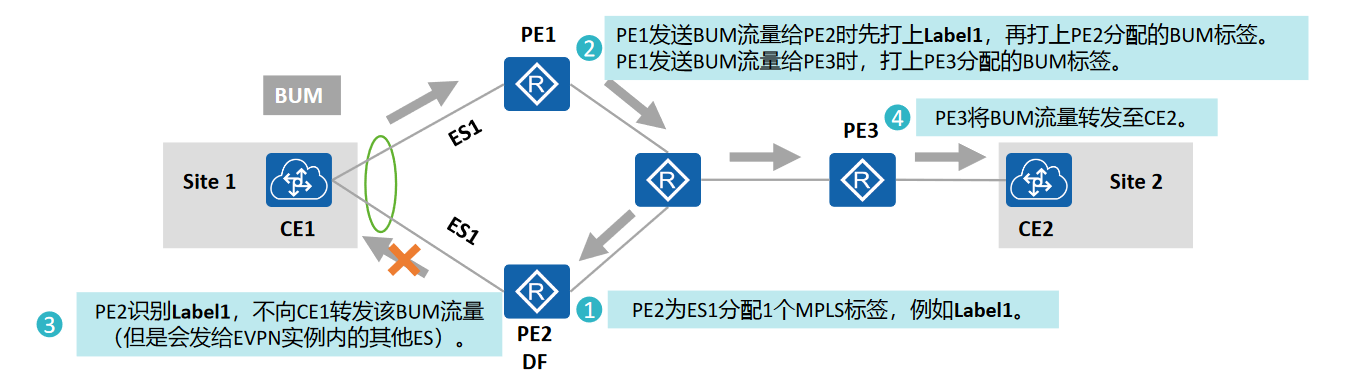ES路由过滤:ES-Import RT只允许连接相同站点的PE引入TYPE 4路由。RT被用于在所有连接相同站点PE上引入Ethernet Segment路由